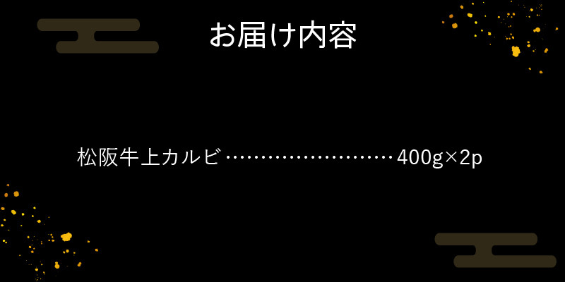 | 容量 | 松阪牛上カルビ:400g×2P(トレイ入り) |
