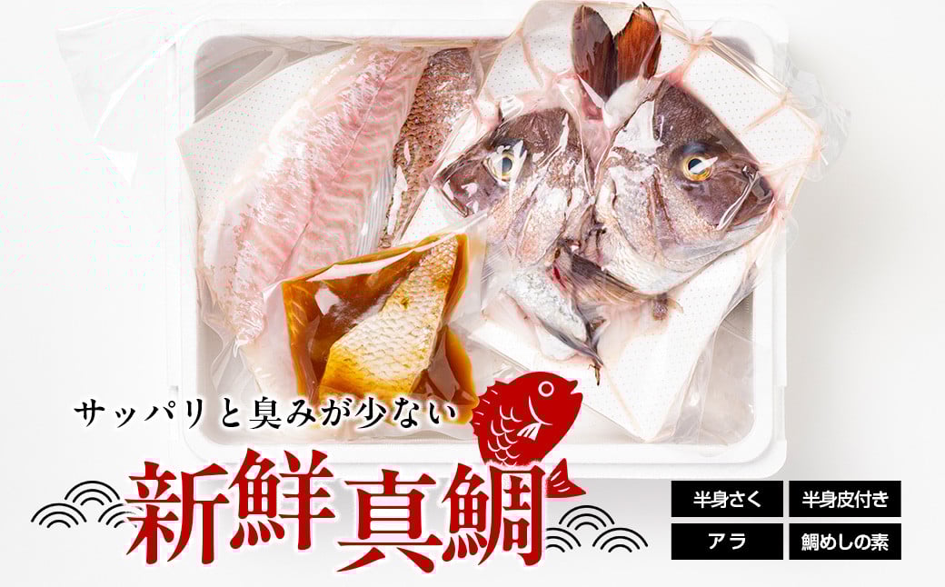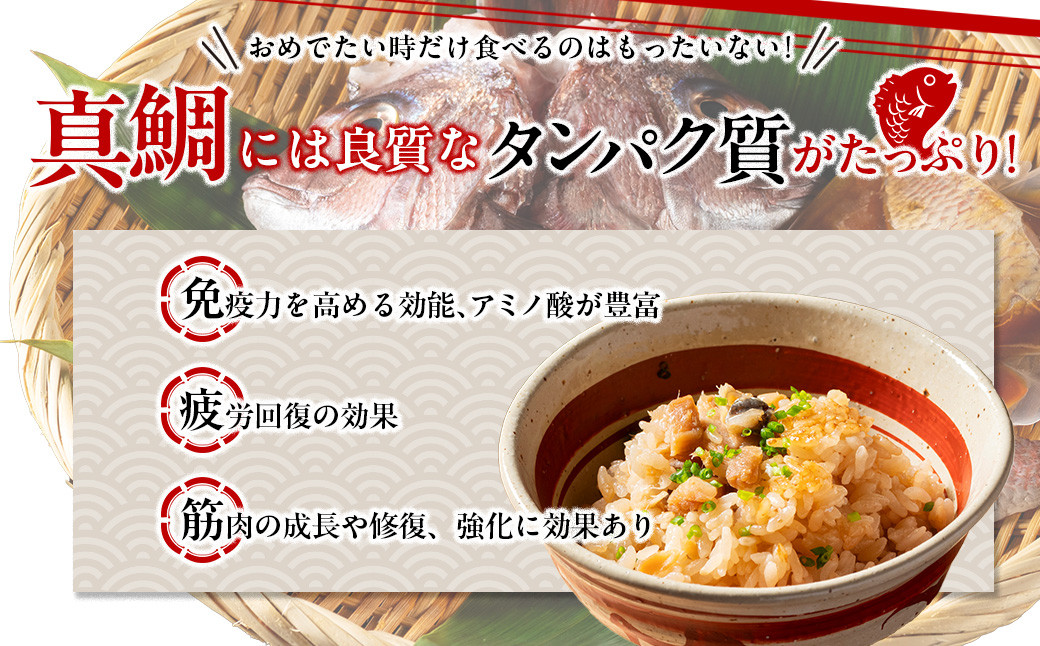 | 容量 | 【No.592】 真鯛1尾(半身さく・半身皮付き・アラ) 鯛めしの素2合3袋 |
