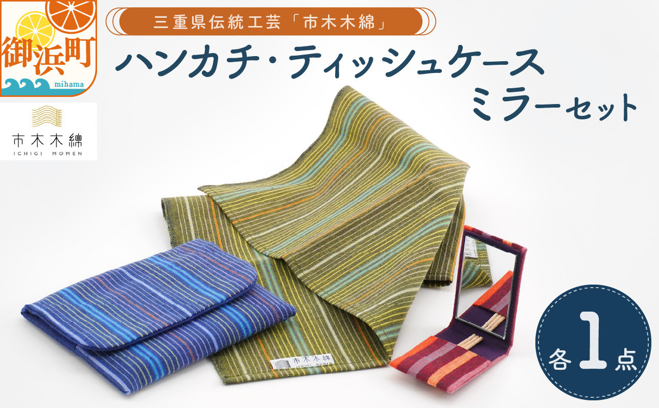 伝統工芸品「市木木綿」を使用した、エチケットセット ! 向井ふとん店の市木木綿エチケットセット【ハンカチ ティッシュケース 鏡 エチケットミラー コンパクト 小さめ セット 詰め合わせ 伝統工芸品 工芸品 市木木綿 三重県 御浜町】