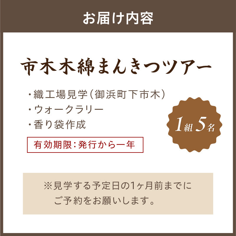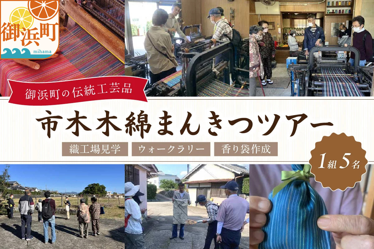 織工場の見学!そして市木木綿で香袋を作ってみよう! 向井ふとん店の市木木綿まんきつツアー(5名)【ツアー 観光 織工場 見学 体験 ウォークラリー 市木木綿 三重県 御浜町】
