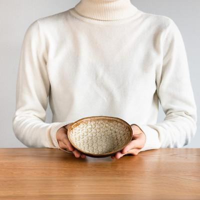 小さい深皿は、煮物やお鍋の取皿、サラダなどのお皿にぴったりです。 深さがしっかりあるので、汁気のある料理も盛り付けていただけます。 約14センチの緩やかな楕円形で、片手におさまるサイズ感になっています。