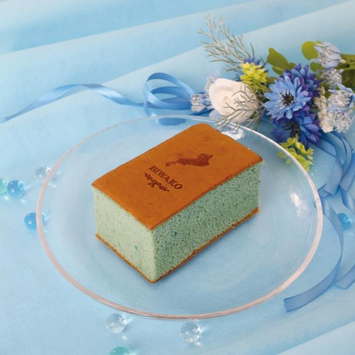 琵琶湖の青をイメージして天然色素のバタフライピーの青色を使い、ふんわりしっとりしたカステラを焼き上げました。地元産・国産のこだわりの材料を使い、カステラに適した南蛮窯で、1本1本丁寧に焼き上げました。琵琶湖の焼印を押させていただいております。
