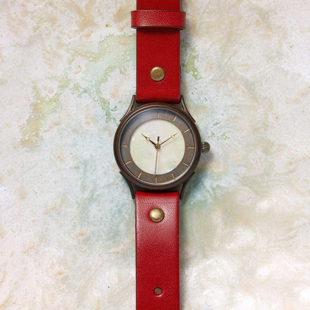 伝統工芸品【螺鈿(らでん)白】の文字盤が美しいハンドメイドウォッチ バーデザイン ベルトカラー:赤 WJ002L 螺鈿白-赤