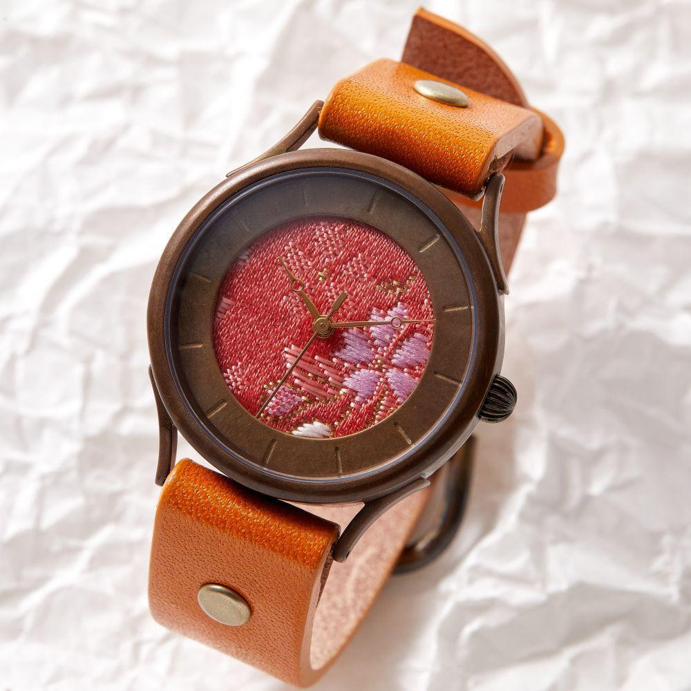 伝統工芸品【西陣織 赤】の文字盤が美しいハンドメイドウォッチ バーデザイン ベルトカラー:蜜柑 WJ002L 西陣赤-蜜柑