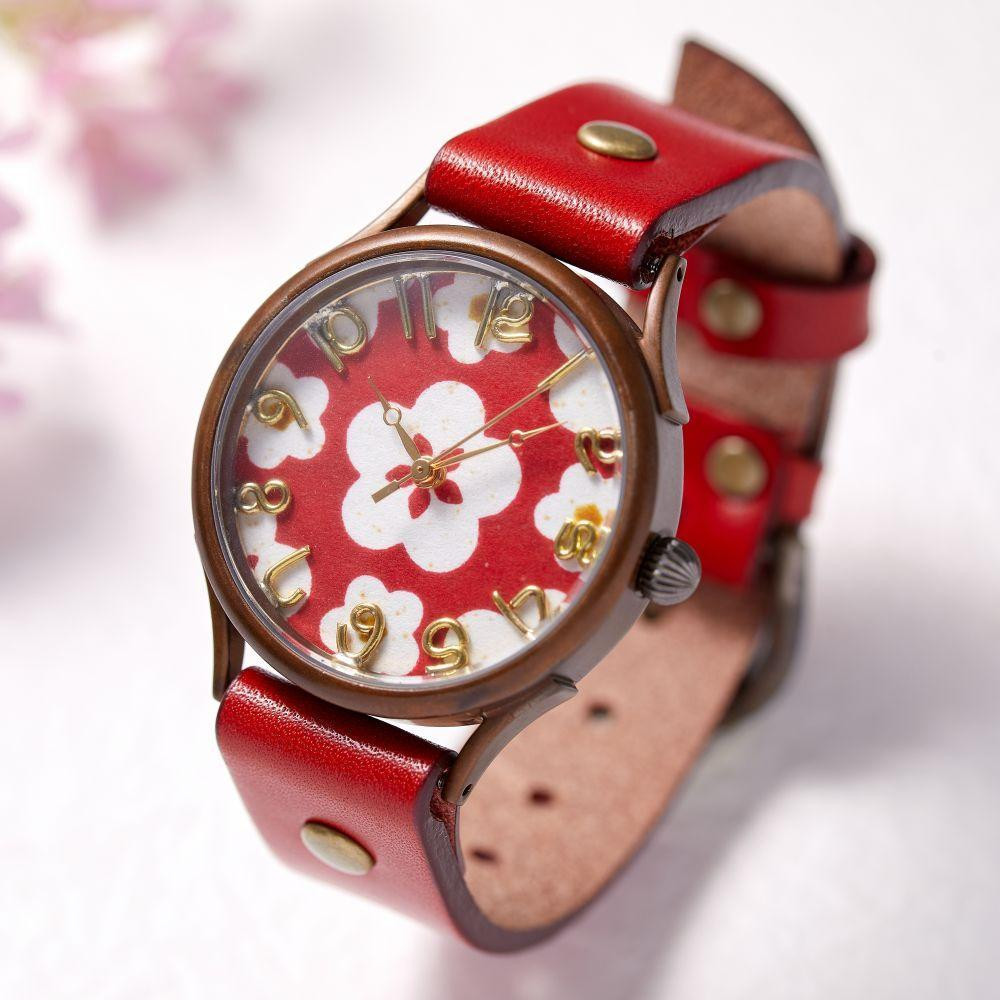伝統工芸文様【梅】の文字盤が美しい 和染千代紙で作ったハンドメイドウォッチ ベルトカラー:赤 WJ004L 梅-赤