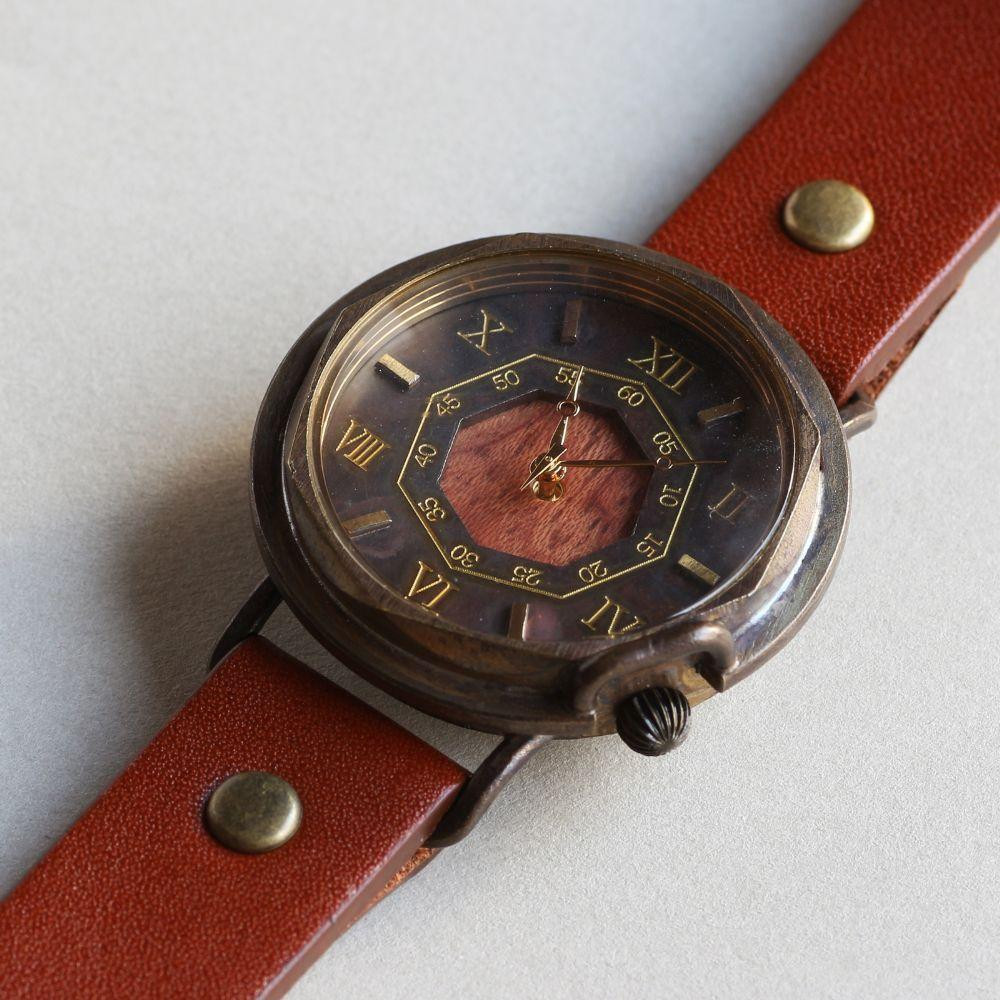 天然樹木【ブビンカ】と八角形デザインの文字盤が可愛いハンドメイドウォッチ Mサイズ ベルトカラー:茶 WB007M W2-茶