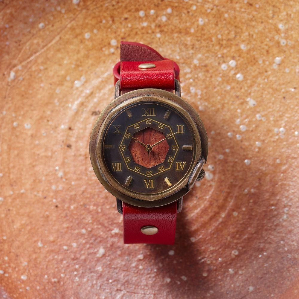 天然樹木【ブビンカ】と八角形デザインの文字盤が可愛いハンドメイドウォッチ Mサイズ ベルトカラー:赤 WB007M W2-赤