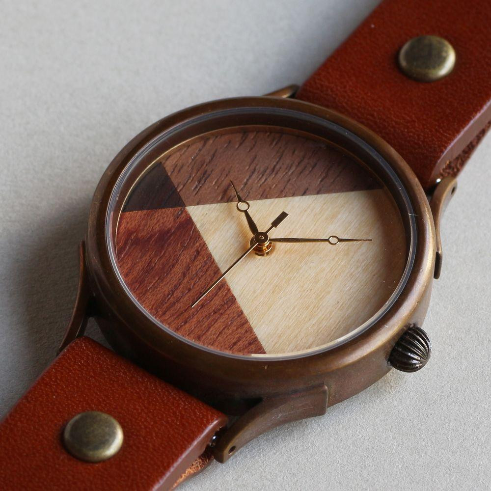 【ペアウォッチ】4種類のナチュラルウッドを組合わせが可愛いハンドメイドウォッチ WB077ペアセット Lサイズ-茶・Xサイズ-オリーブ