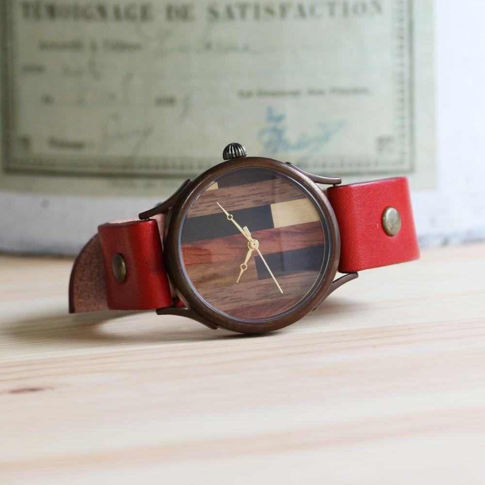 【ナチュラルウッド】パズルのような文字盤が可愛いハンドメイドウォッチ Lサイズ ベルトカラー:赤 WB082L 赤