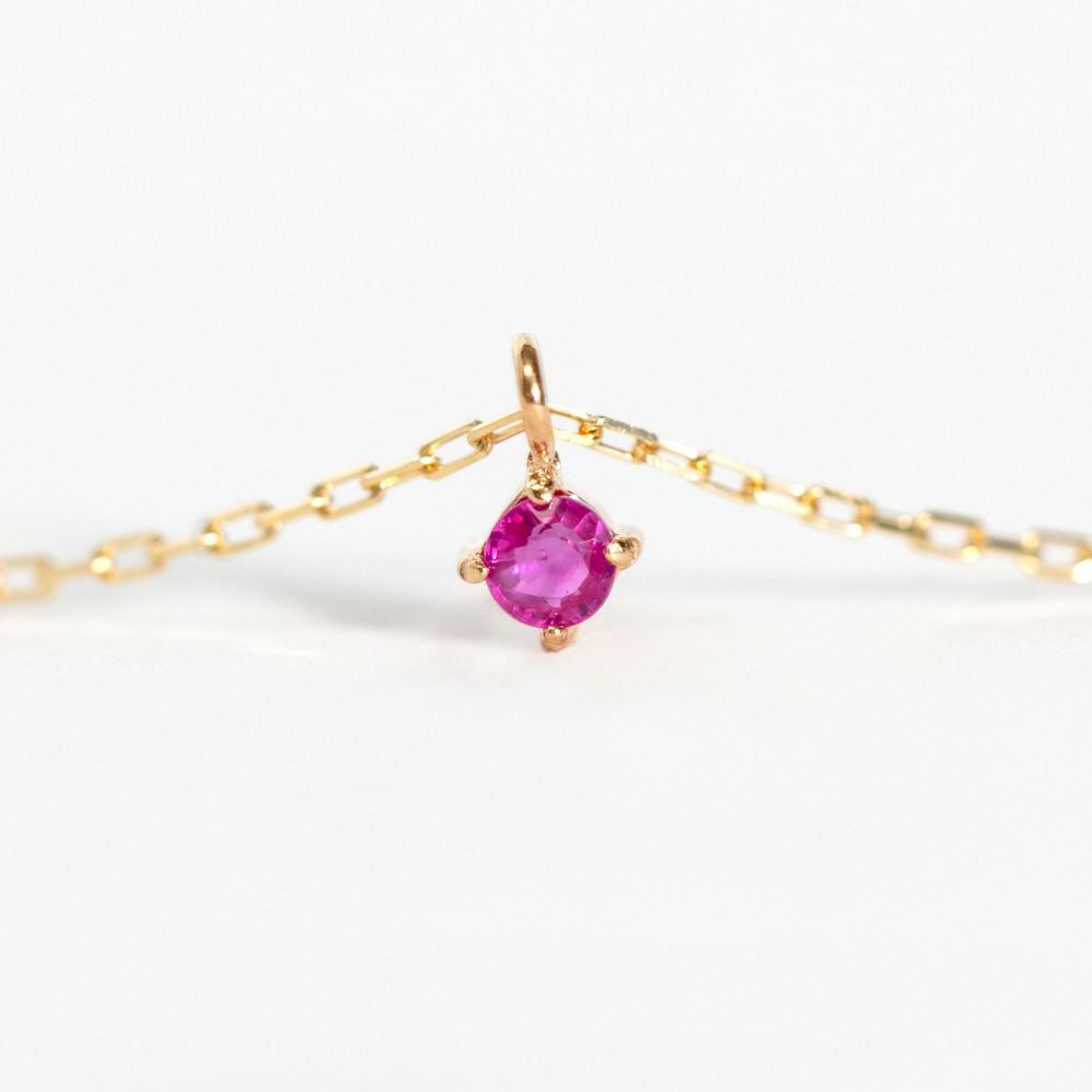 7月誕生石のルビー。ご自身の生まれ月のストーンを身に着けると災いから守ってくれると言われています。またアクセントカラーの天然石ネックレスとして楽しむことができます。