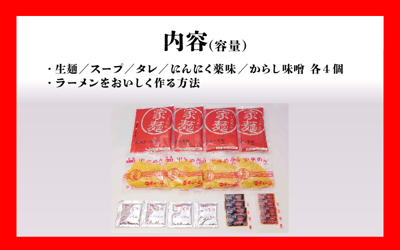 | 容量 | ・生麺/スープ/タレ/にんにく薬味/からし味噌 各4個 ・ラーメンをおいしく作る方法 |