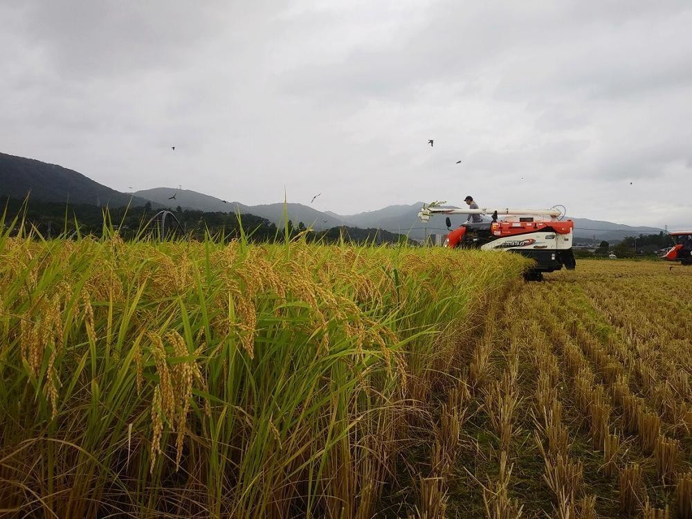 マメ科の植物「へアリーベッチ」を肥料代わりに育てたお米、大津市特産の「はなふじ」コシヒカリです。