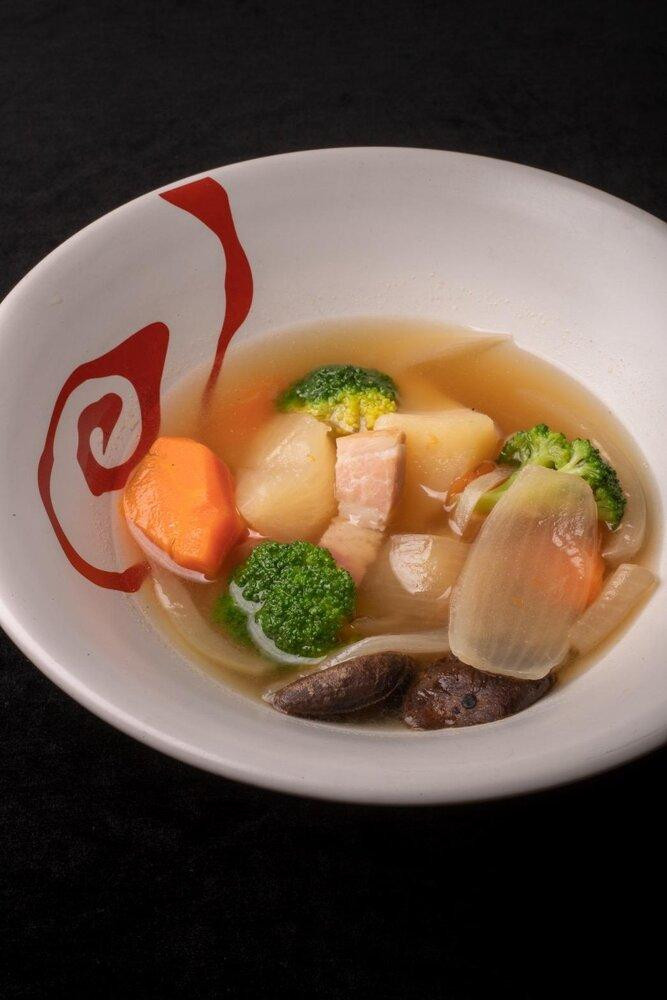 ベーコンに和風のカツオ出汁と原木椎茸の旨味がたっぷり入った和風ポトフです。