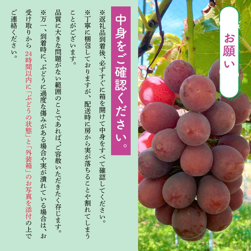 ・万一到着時に、ぶどうに過度な傷みがある場合や実が潰れている場合は、お受け取りから24時間以内に「ぶどうの状態」と「外装箱」のお写真を添付の上でご連絡ください。