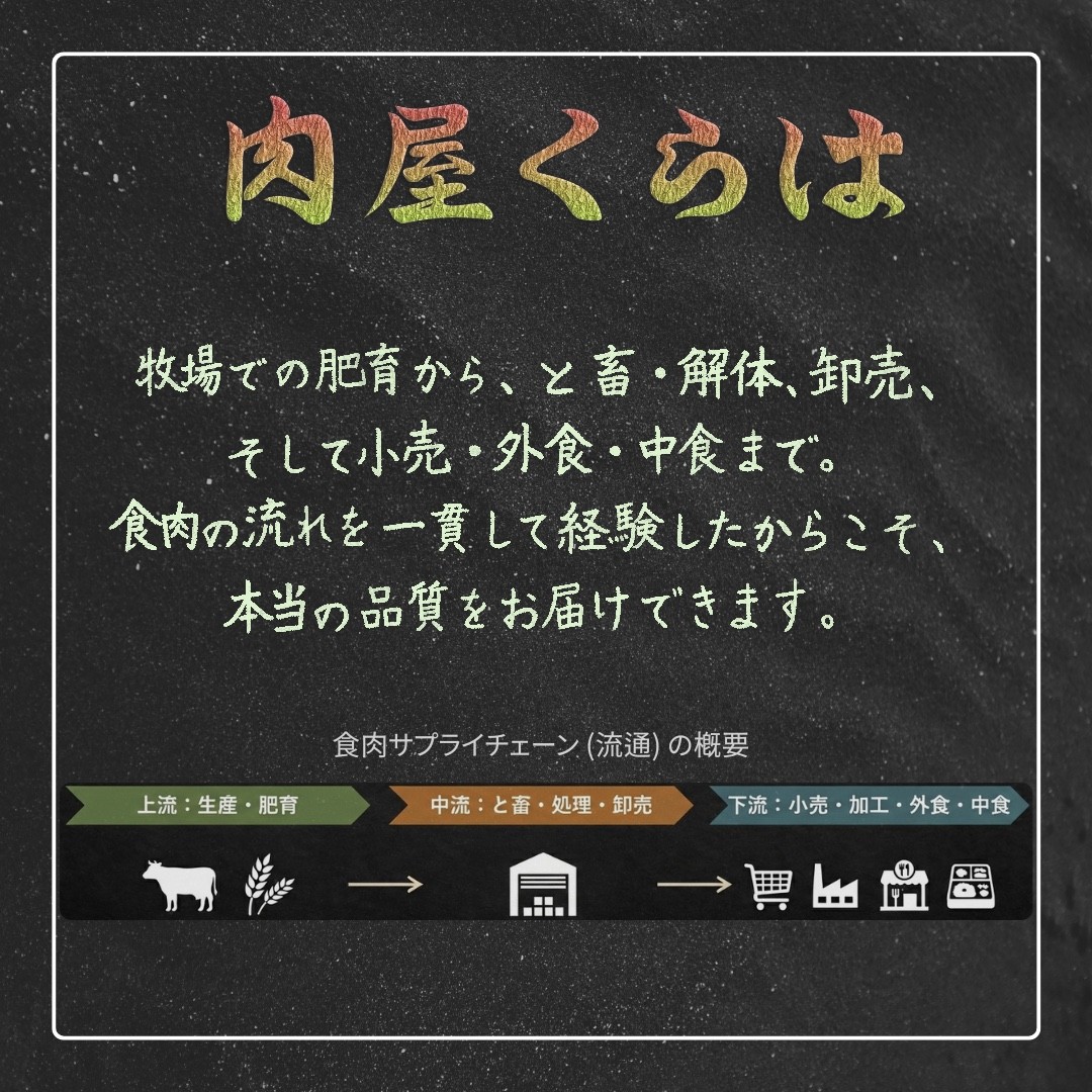 彦根城下町で夫婦ふたりが営む精肉店・肉屋くらはです。約20年間、近江牛のステーキ重の専門店を営んできた経験が仕入れ・選別の礎です。「元祖ステーキ重」発祥の店として何千枚の肉を焼き、焼いたときに旨い肉を見極める力を身につけました。仕入れ・精肉・発送まで夫婦二人で担い、自分の家族が美味しく安心して食べられるお肉であることを基準に選んでいます。