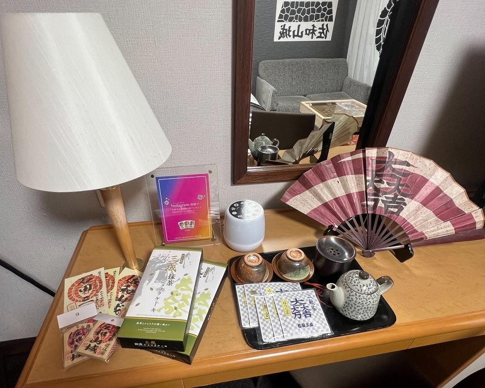 彦根に大変ゆかりのある戦国武将石田三成公のグッズを多数取り揃えた特別仕様のお部屋です。お部屋には石田家の家紋の入った陣幕があり、まるで本陣にいるような気分を味わえます。