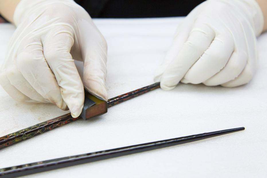 事前に色漆を塗った箸をペーパーで研ぐ(こする)と鮮やかな色が出てきます。研ぎ具合で色漆の表情は変化しますので、自分だけのオリジナルの箸をお作りいただけます。