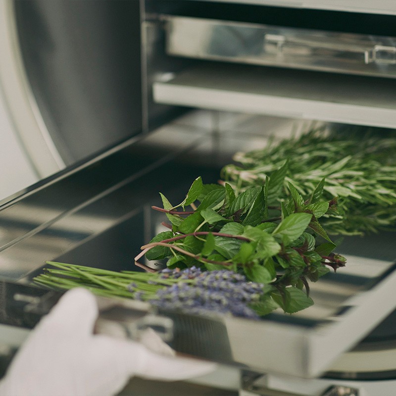 独自のプログラムにより低温でじっくり時間をかけて加工を行うことで、安定した美味しさを実現。 高温乾燥や粉砕加工を行わないハーブにやさしいプロセスで、摘みたてのような香り、味わい、彩りが愉しめます。