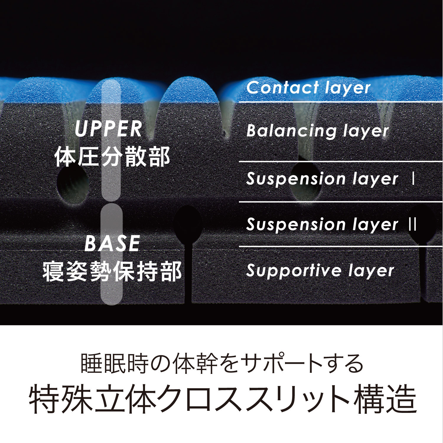 ■自然な寝姿勢をキープする ベース部が身体をしっかり受け止め、自然な寝姿勢をキープします。体圧を分散することで寝返りもスムーズにでき、リラックスした深い眠りをサポートします。