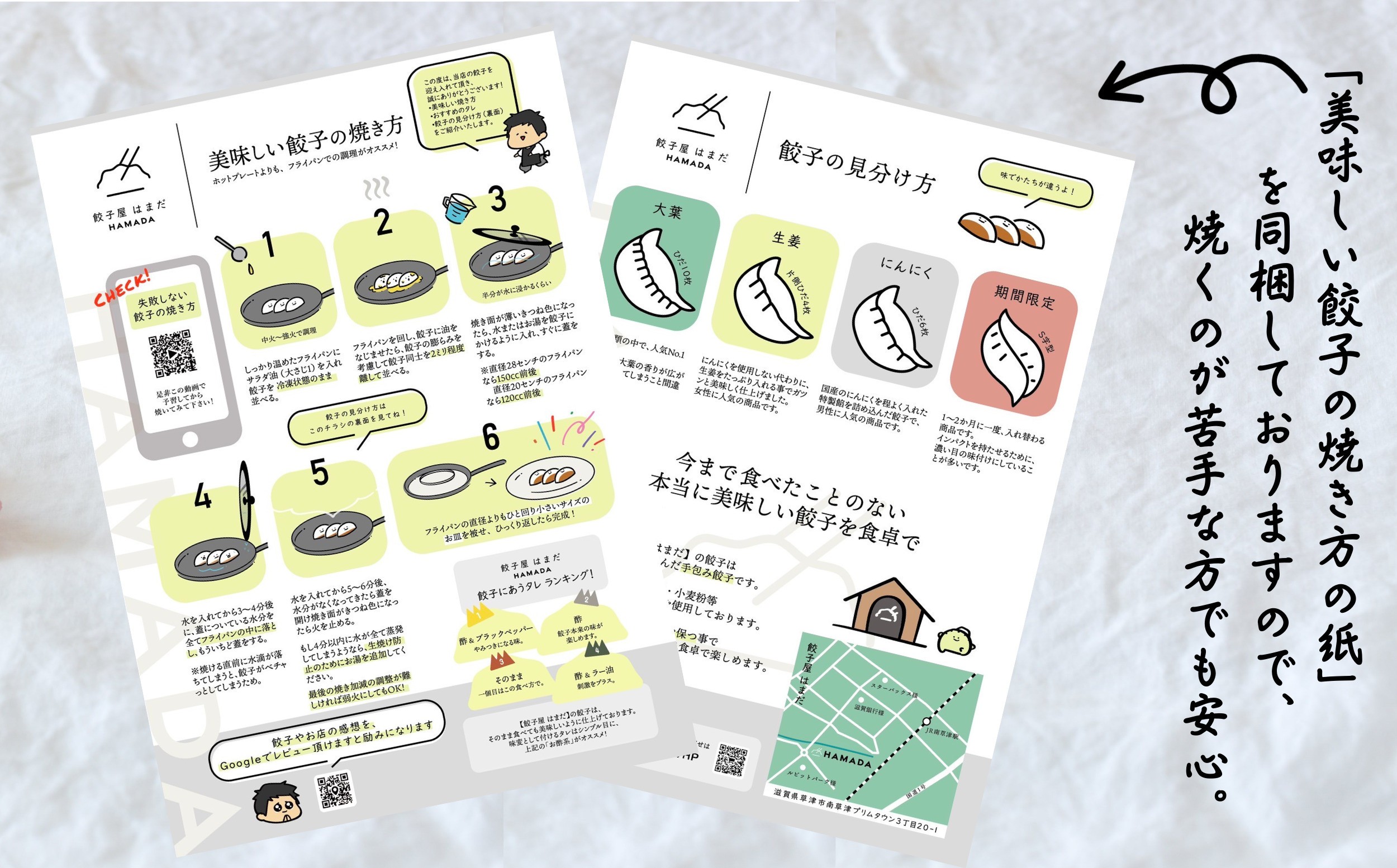 滋賀県草津市にある「餃子屋 はまだ」は、手包み餃子専門店で、地元で愛される人気店です。もちもち皮の餃子を、冷凍餃子として全国へお届けしています。お店では冷凍餃子の販売はもちろん、買う前に試食もできますので、ぜひお立ち寄りください。