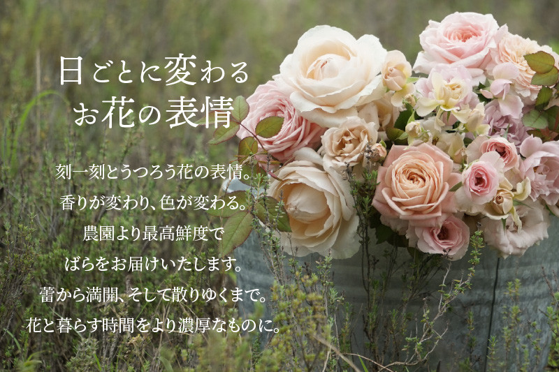 農園でのびのびと育つわばら達は、茎のしなやかさが特徴。 茎の曲線を楽しみながら、一輪ずつ飾るのもおすすめしています。