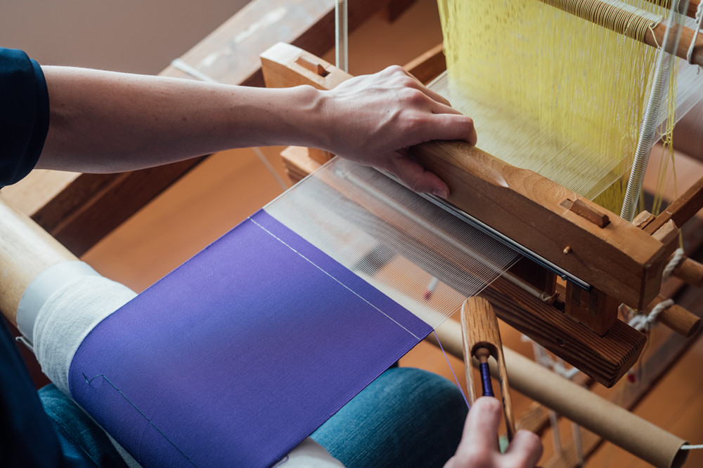 極細のラインを、正確かつ直線的に織り込めるのも、手織りならではの技術のひとつ。内側のポケットのエッジ部分にも箔の糸のラインが入っています。