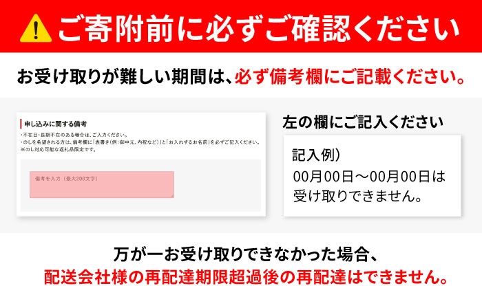 入金確認後、1ヶ月程度で発送いたします。 ※申込増加に伴い、発送までに2-3ヵ月程度お時間をいただく場合がございます。予めご了承ください。 ※離島への配送はいたしかねます。 ※上記のエリアからの申し込みは返礼品の手配が出来ないため、「キャンセル」または「寄附のみ」とさせていただきます。予めご了承ください。 |
