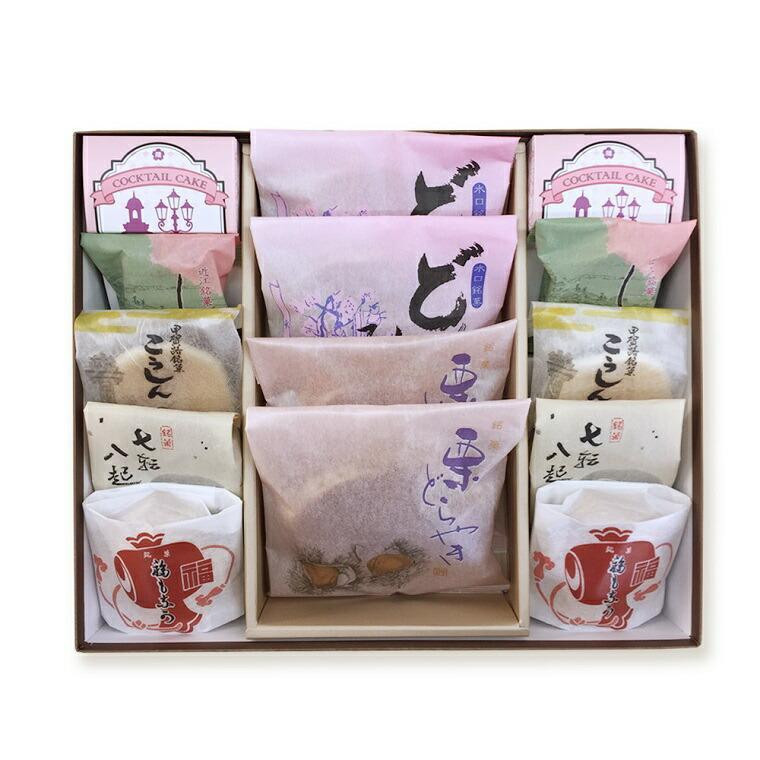 | 容量 | カクテル・こうしん・七転八起・しるべ・福もなか ・どんどひぶ・栗どらやき 各2個 <原材料> カクテル…砂糖(国内製造)、卵、小麦粉、ラム酒、水飴/膨張剤、香料、(一部に卵を含む) こうしん…砂糖(国内製造)、小豆生餡、水飴、ふやき(餅米、砂糖)、白玉粉 七転八起…砂糖(国内製造)、小豆、水飴、寒天 しるべ…砂糖(国内製造)、小豆生餡(小豆)、小麦粉、卵、水飴、乳等を主要原料とする食品(植物性油脂、脱脂粉乳)、油脂加工品(植物油脂、澱粉糖化液)、食塩/加工澱粉、乳化剤、メタリン酸Na、香料、(一部に小麦、卵、乳成分・大豆を含む) 福もなか…砂糖(国内製造)、小豆、最中種(餅米)、水飴、寒天、寒天加工品(麦芽糖、寒天)/トレハロース どんどひぶ…砂糖(国内製造)、卵、小麦粉、小豆、水飴、蜂蜜、乳等を主要原料とする食品(植物性油脂、乳製品)、油脂加工品(植物油脂、澱粉糖化液)、寒天/膨張剤、加工澱粉、乳化剤、ph調整剤、(一部に卵・小麦・乳成分・大豆を含む) 栗どらやき…砂糖(国内製造)、卵、小麦粉、栗甘露煮(栗、砂糖)、小豆、水飴、乳等を主要原料とする食品(植物性油脂、乳製品)、蜂蜜、油脂加工品(植物油脂、澱粉糖化液)、寒天/膨張剤、加工澱粉、乳化剤、着色料(クチナシ色素)、ph調整剤、(一部に卵・小麦・乳成分・大豆を含む) |