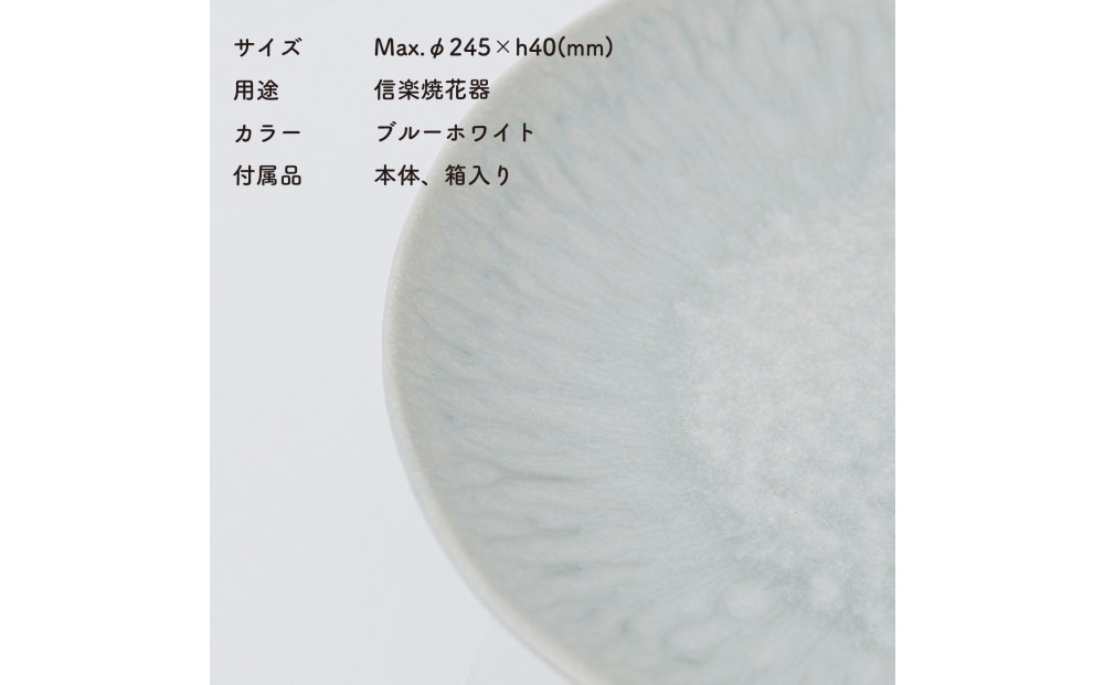 | 容量 | 内容:本体、箱入り サイズ:W245 x H40(mm)※たたら打ちのため、誤差が生じます。 仕様:信楽焼食器 電子機器:電子レンジ:○ 食洗機:△ オーブン:× ・画像はイメージです。 ・製品の色、柄、寸法はひとつひとつが手作業で作っております。その為、写真と多少の違いが生じる場合がございます。また、パソコンの環境(モニター)により、製品の見え方も多少異なります。 ・製品の性質上、釉薬の色味や表情の出方、サイズの歪みには個体差がありますが、品質に問題のない社内検品済み商品ですので、陶器ならでは風合いとしてお楽しみください。 ・陶製品はデリケートで破損しやすいです。取り扱いには十分、お気をつけ下さい。 ・食洗機はお使い頂けますが、長持ちさせるためにも手洗いをおすすめします。 ・製品の取扱については付属の説明書をお読みください。 |