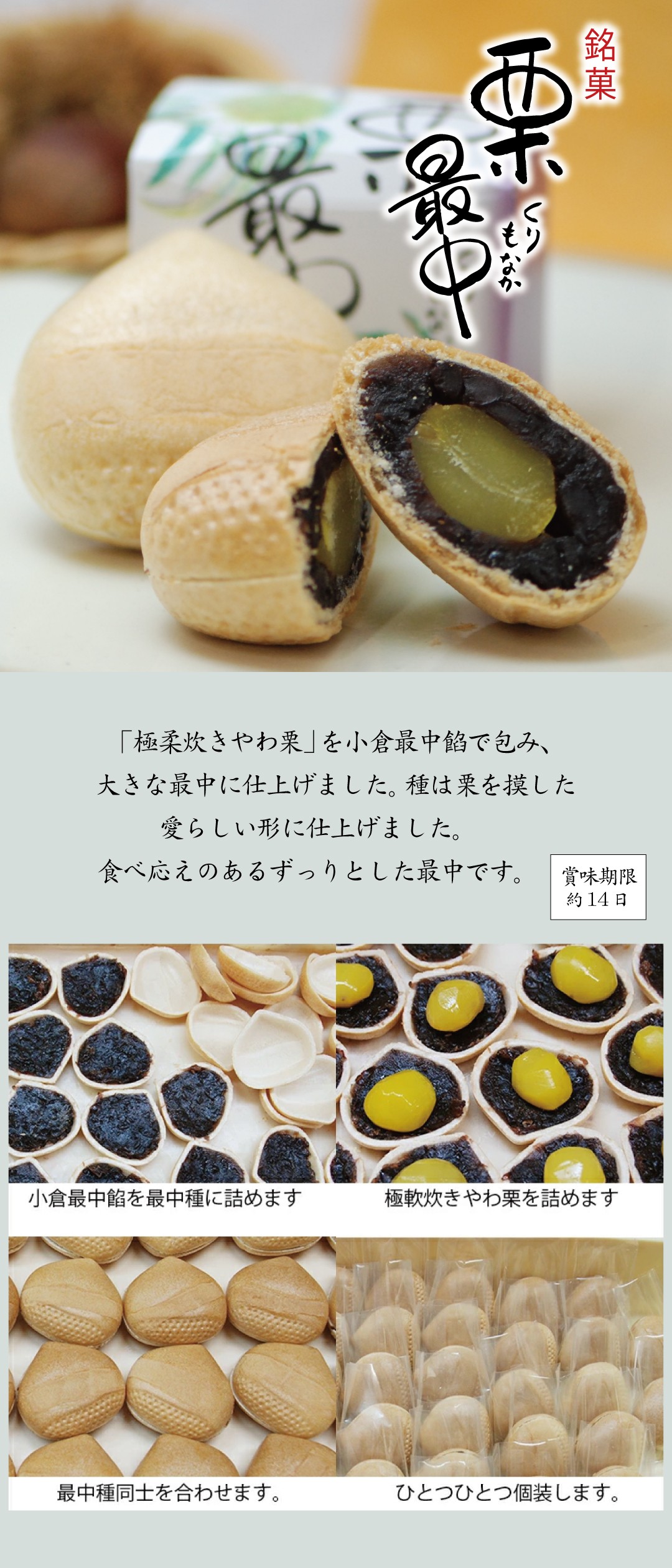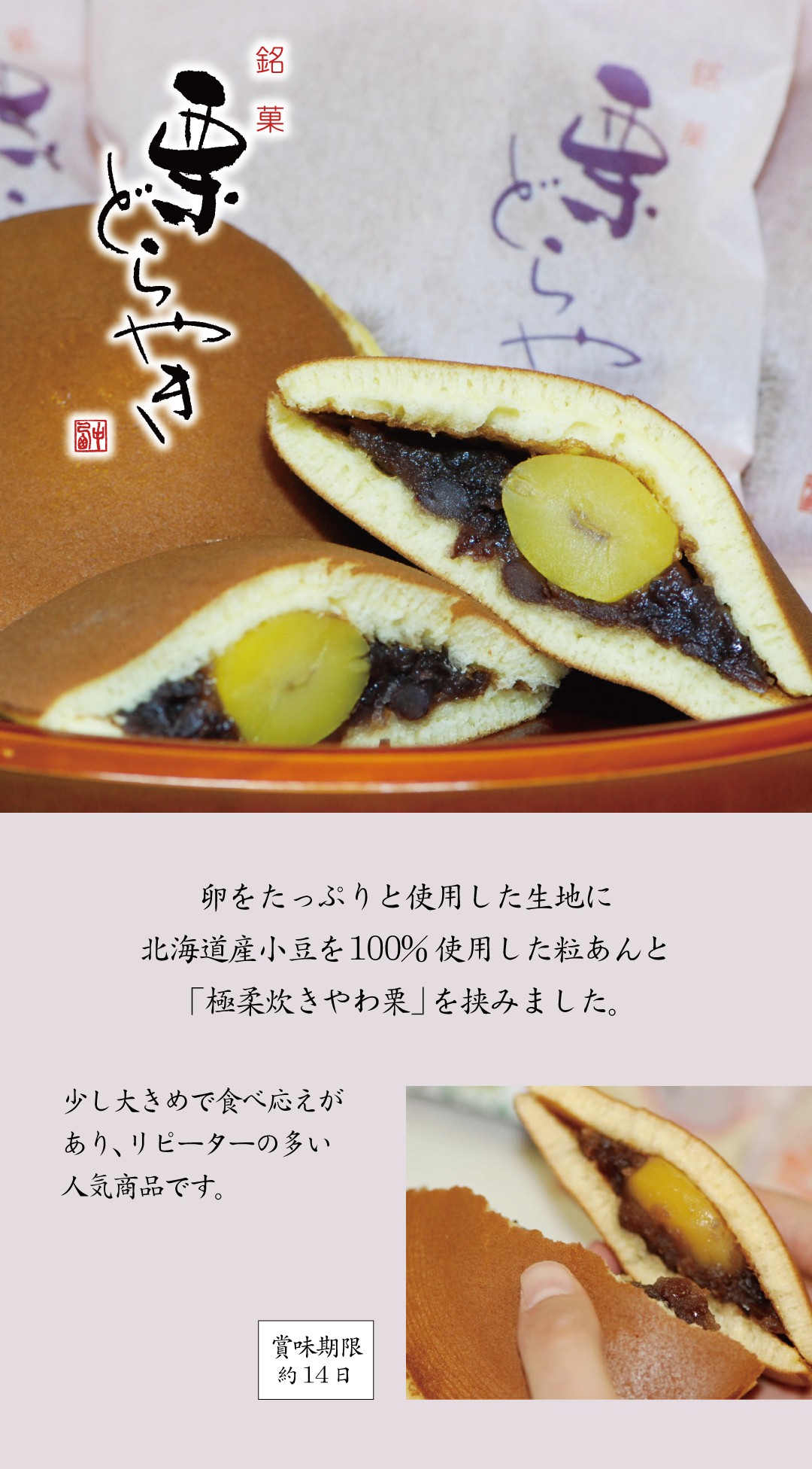 | 消費期限 | こうしん…20日 栗どらやき、栗最中…14日 ※直射日光・高温多湿を避け冷所で保存 |