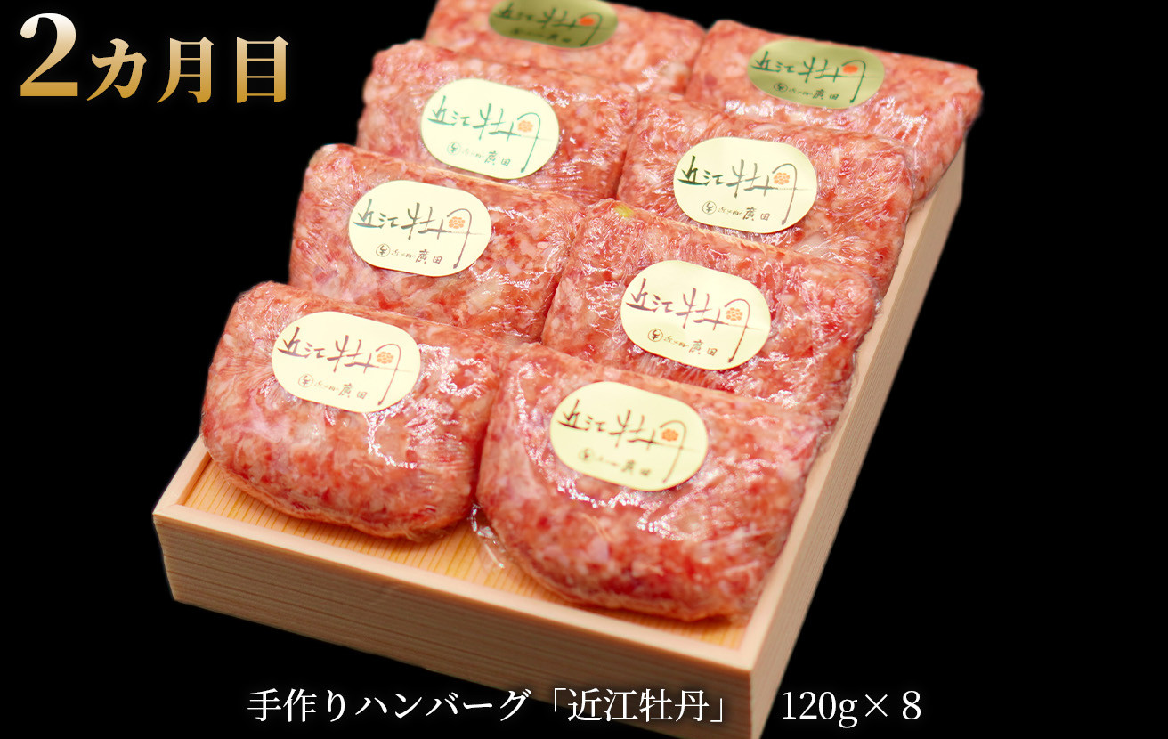 | 容量 | 1カ月目:A5ランク近江牛肩ロースすき焼き・しゃぶしゃぶ用500g 2カ月目:手作りハンバーグ「近江牡丹」120g×8(冷凍) 3カ月目:A5ランク近江牛モモ・バラ焼肉用 計600g 4カ月目:A5ランク近江牛ステーキセット(ヒレ3枚/計約360g・ロース3枚/計約750g) |