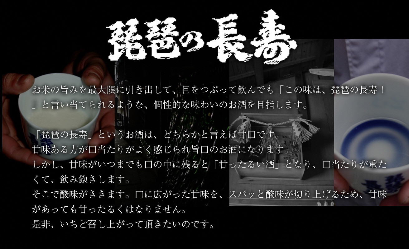 お米の酒たるもの、お米の旨味がしっかり引き出されていなければ。そんなコンセプトで造った純米吟醸です。 フルボディな味わいで十分な旨味があるのですが、ビワチョウお得意のワインにも似た酸味があり、酸味が後味をキリッ!…と切り上げてゆくのでキレが良い、そんな味わいのお酒です。 よく「甘口ですか?辛口ですか?」と訊かれますが、「甘口」でも「辛口」でもないところに「旨口」という味わいがあります。 このお酒は完全に「旨口」です。