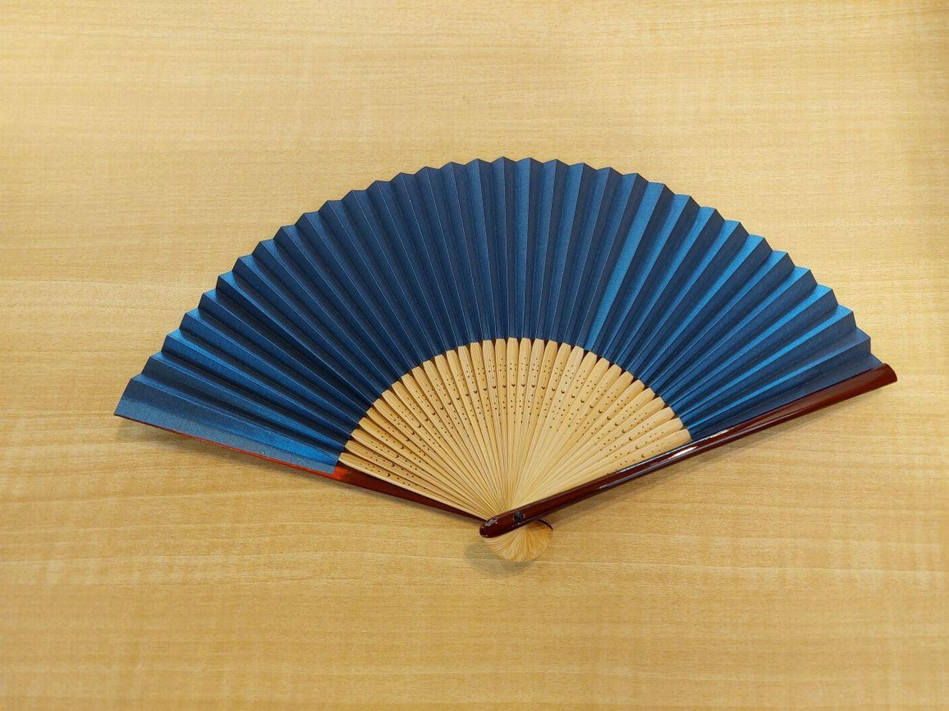 長さが6.5寸、35間のスタンダードな扇子。親骨がため塗で、中骨は白竹。柄はこうたくのある青地に白桔梗が描かれています。