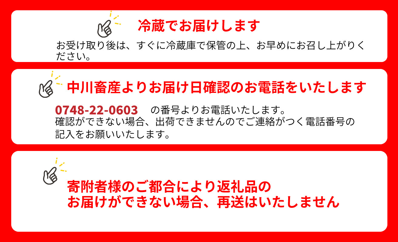 | 容量 | ロースまたは肩ロース800g ※日中連絡可能な連絡先(携帯電話など)をお知らせください。 ※受注後、お届け日時について確認の電話が出荷元(中川畜産 TEL:0748-22-0603)から入ります。 |