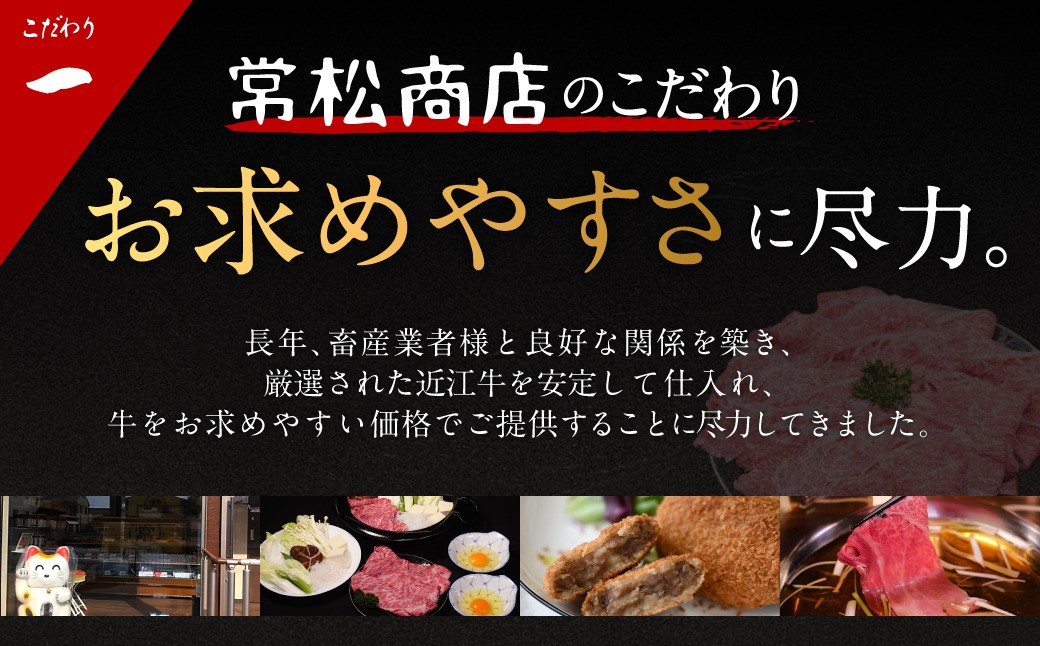 厳選近江牛は、常松商店自慢の商品で日本三大牛の近江牛のうま味と深い味わいをぜひご賞味いただき、 当店の美味しさ探求の真髄をご実感ください。