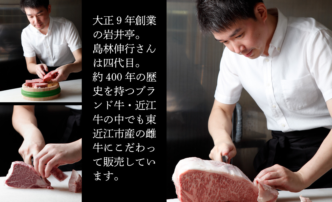 大正9年創業の岩井亭。創業当時から精肉だけでなく、近江牛の味噌漬けにも力を入れて販売し、100有余年もの間、代々その製法を受け継いでおります。近江牛の中でも特に東近江市産の雌牛にこだわり、血統や昔ながらの肥育方法で育った近江牛を店主自ら吟味して仕入れています。