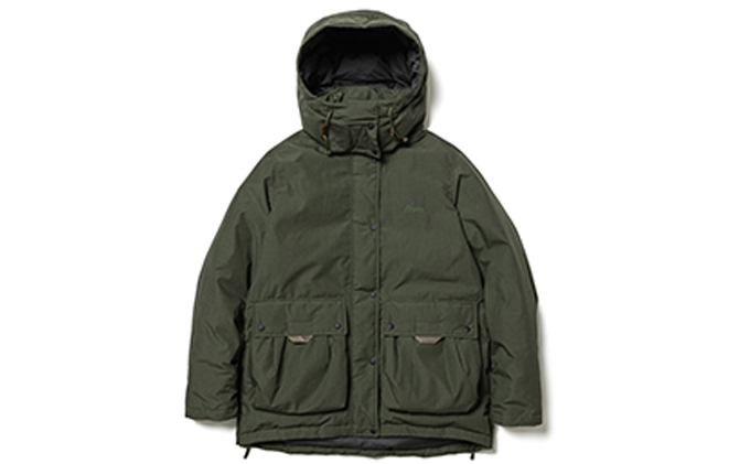 難燃素材であるタキビ生地を採用したレディースモデルはシルエットを尊重し、ポケット数を少なく設定。ウエストポケットにはハンドウォーマーを装備し、超撥水加工を施したダウンを採用。フードは脱着式となっているのでシーンに合わせて使い分けできます。