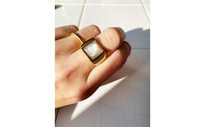 滋賀県の琵琶湖で生産される琵琶パール。その母貝である池蝶貝(イケチョウガイ)を手作業で加工し制作したハンドメイドのリングです。
