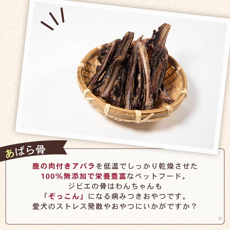 ジビエ(鹿)の肉付きアバラを低温でしっかり乾燥させた100%無添加で栄養豊富なペットフード。 ジビエの骨はわんちゃんも「ぞっこん」になるやみつきおやつです。