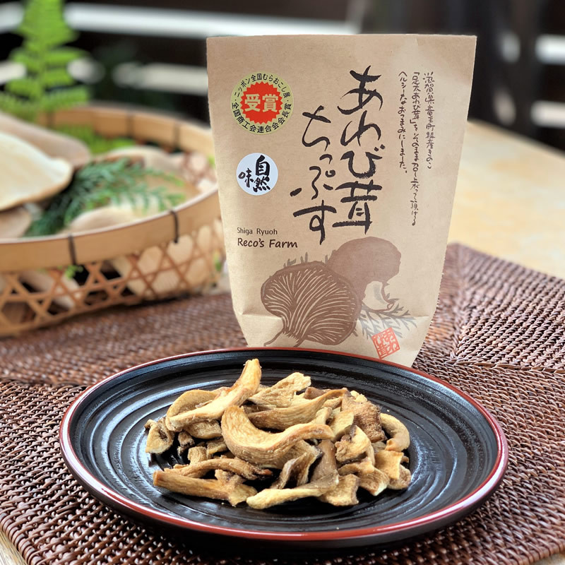 滋賀県竜王産の足太あわび茸(栽培期間中農薬不使用)をまるごと使ったちっぷすです。油分を極力カットする特殊製法により、ヘルシーでカリッと仕上げてあります。大人のおつまみからお子様のおやつまで、ご家族皆様で5種類の味をお楽しみください。