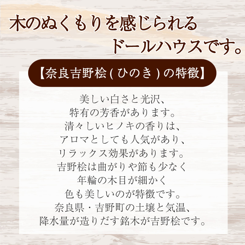 | 容量 | ドールハウス1個(閉じている時)H365mmW340mm奥行167mm ※画像内にある人形や家具などは含まれません。 【原材料】 国産桧材 |