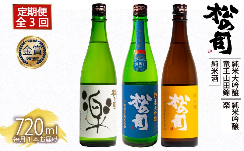 松の司 純米酒、純米吟醸 楽、純米大吟醸 竜王山田錦 720mlを毎月1本 計3本お届けします。