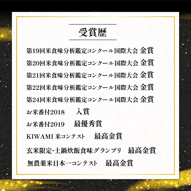 『米・食味分析鑑定コンクール国際大会』にて金賞受賞歴を重ね、また日本米穀小売商業組合連合会(日米連)に認定された京の米老舗八代目儀兵衛のお米マイスター20名が、「7つの審査基準」に則り審査するお米番付で最優秀賞を受賞しております。