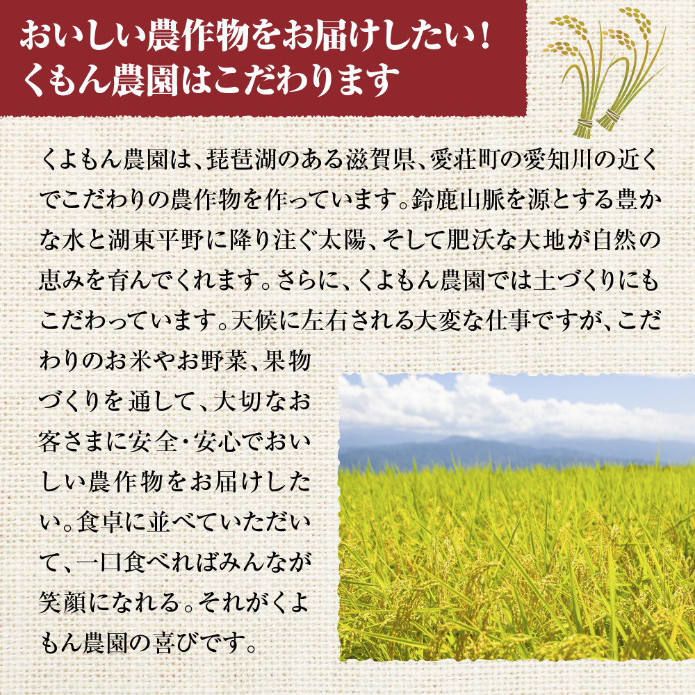 くよもん農園は、琵琶湖のある滋賀県、愛荘町の愛知川の近くでこだわりの農作物を作っています。鈴鹿山脈を源とする豊かな水と湖東平野に降り注ぐ太陽、そして肥沃な大地が自然の恵みを育んでくれます。さらに、くよもん農園では土づくりにもこだわっています。天候に左右される大変な仕事ですが、こだわりのお米やお野菜、果物づくりを通して、大切なお客さまに安全・安心でおいしい農作物をお届けしたい。食卓に並べていただいて、一口食べればみんなが笑顔になれる。それがくよもん農園の喜びです。