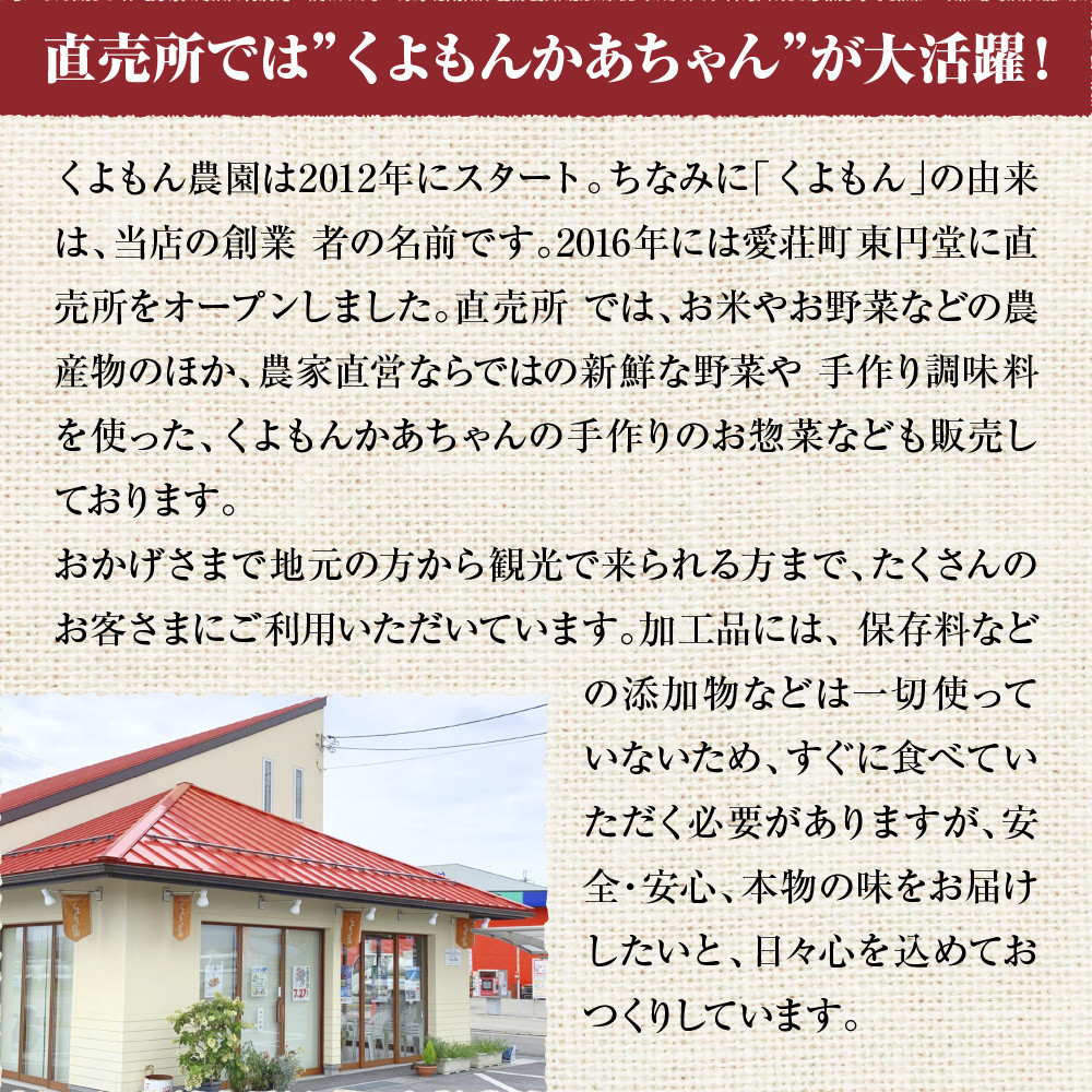 くよもん農園は2012年にスタート。ちなみに「くよもん」の由来は、当店の創業者の名前です。2016年には愛荘町東円堂に直売所をオープンしました。直売所では、お米やお野菜などの農産物のほか、農家直営ならではの新鮮な野菜や手作り調味料を使った、くよもんかあちゃんの手作りのお惣菜なども販売しております。