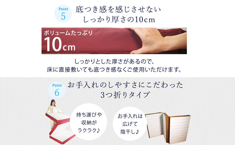 底付き感を感じさせないしっかり厚さの10cm。敷き布団として直接、床にもベッドフレームの上のベッドマットレスにもなる厚さです。