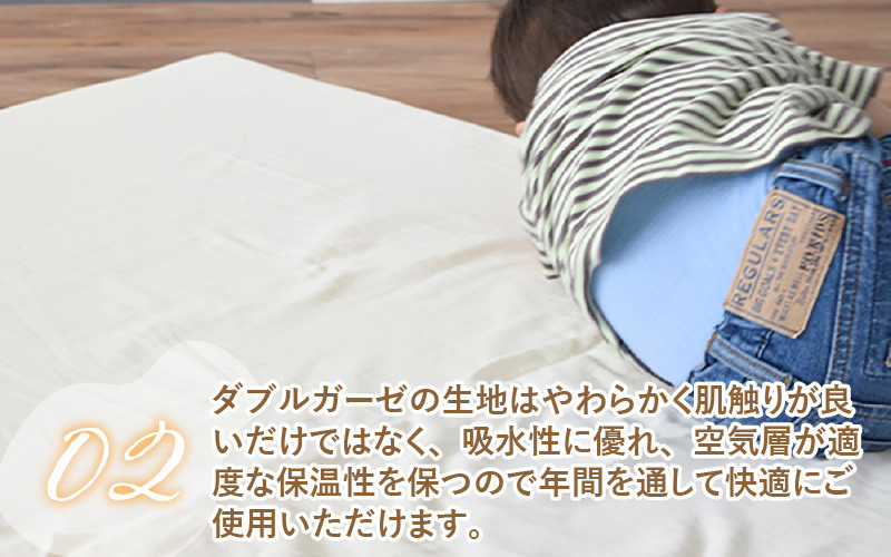 ダブルガーゼの生地はやわらかく肌触りが良いだけではなく、吸水性に優れ、空気層が適度な保温性を保つので年間を通して快適にご使用いただけます。