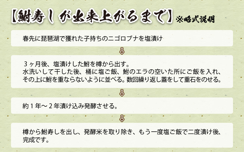 鮒寿しをニ度漬け、塩抜きをしているため、まろやかな仕上げとなっております。