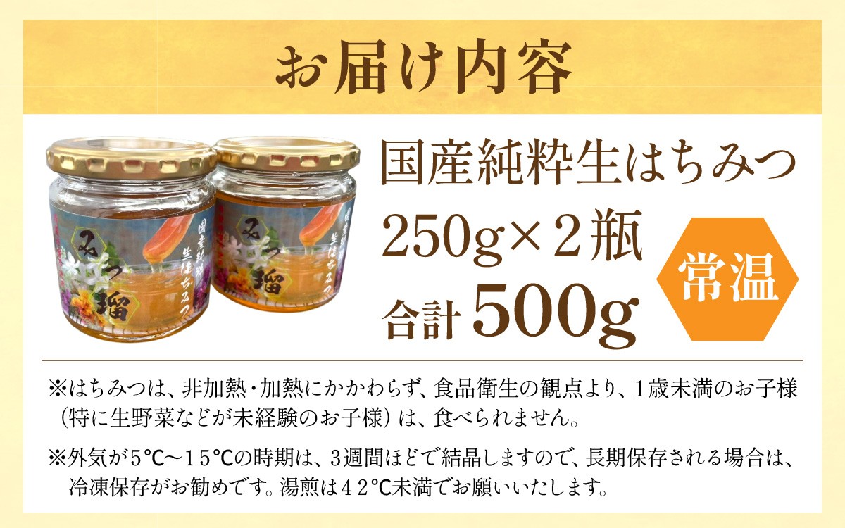 | 容量 | 国産純粋生はちみつ 250g × 2瓶セット(500g) |