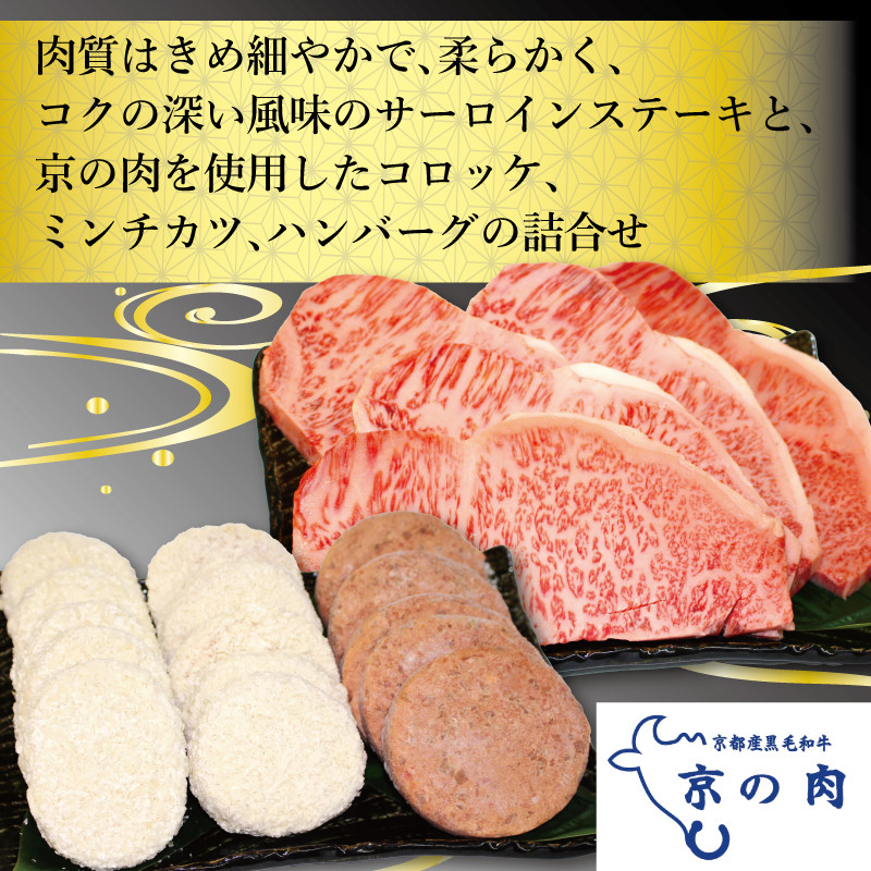 サーロインステーキと京の肉を使用したコロッケ、ミンチカツ、ハンバーグを京都府のふるさと納税限定でセットにした「京の肉」を堪能できる詰合せです。